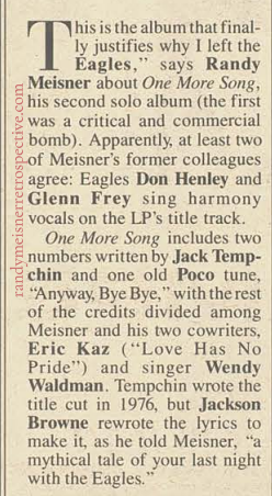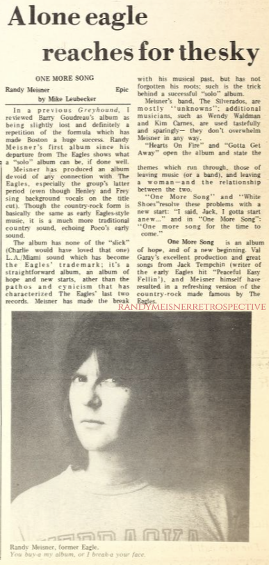 ![]() | December 27, 1980 | Melody Maker | “Randy Meisner: One More Song” | What they liked: “Gotta Get Away” and “Anyway Bye Bye.” |