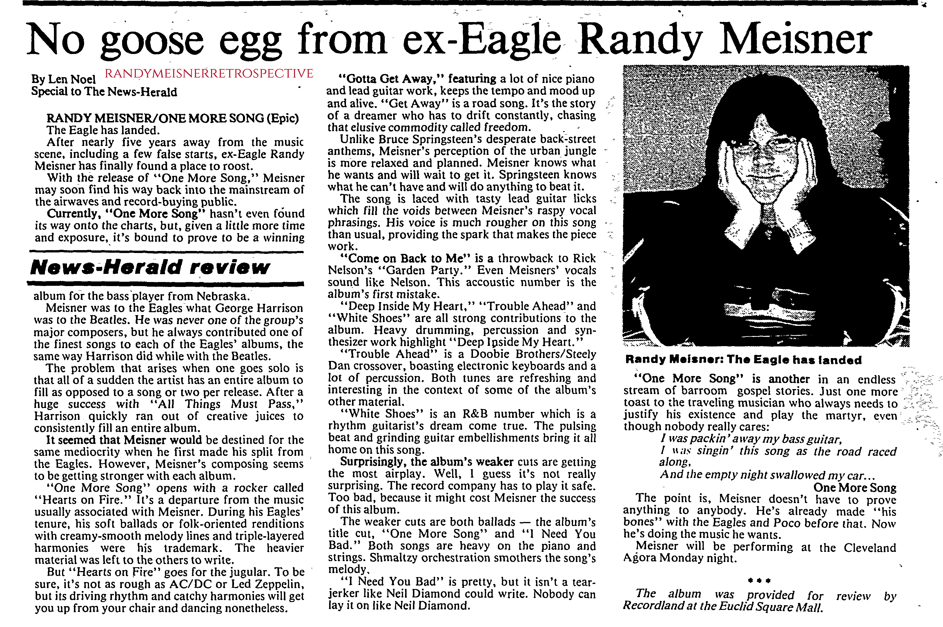 ![]() | November 14, 1980 | Rocky Mountain News (Denver) | “Randy Meisner: One More Song” | “On this one, you should try the blindfold test. The first cut on either side will do. Ten seconds into either song, you’ll be saying. ‘I know that voice!'” |