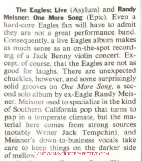 ![]() | December 22, 1980 | Time | Eagles Live & Randy Meisner: One More Song | The Eagles Live album and One More Song are reviewed in same article. Hint: They preferred One More Song. |