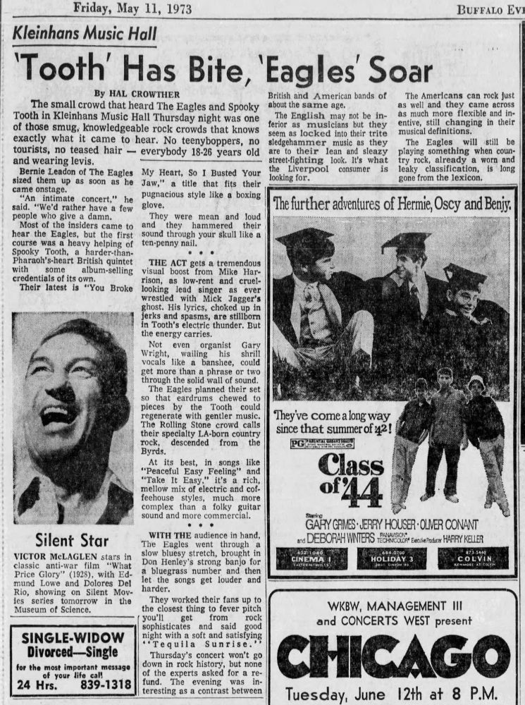 How cool that you got to see them in 1973! I’m sure they were performing songs from Desperado, since it would have just been released the previous month. Spooky Tooth was the opening act. Here’s a review of the show from the Buffalo News, May 11, 1973: